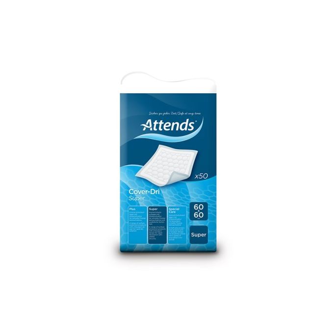 ATTENDS Cover Dri Super 60 x 60 cm is ontwikkeld om lig- en zitoppervlakken extra betrouwbaar te beschermen tegen vocht bij matige tot zwaardere urine-incontinentie. Deze onderleggers zijn geschikt voor gebruik op bedden, stoelen en andere oppervlakken waar een verhoogde absorptiecapaciteit gewenst is. Door de combinatie van een krachtige absorberende kern en een waterdichte onderzijde ondersteunt dit product het behoud van een schoon en droog oppervlak.