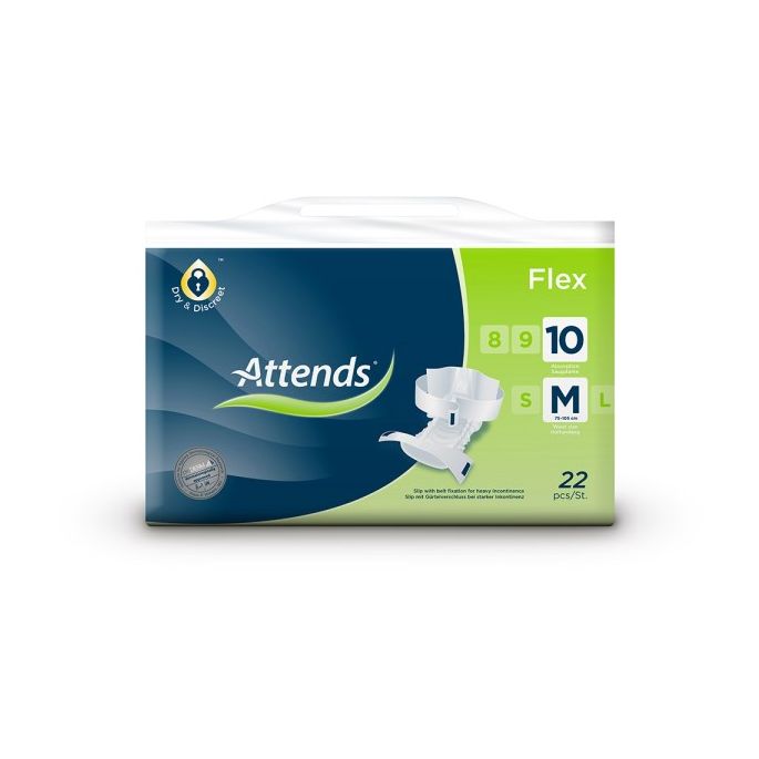 ATTENDS Flex 10 is een alles-in-één incontinentieproduct met heupband, ontwikkeld voor gebruikers met zware urine- en/of ontlastingsincontinentie. Deze uitvoering betreft maat Medium (M) en is geschikt voor een heupomvang van 75 tot 105 cm. Het product combineert een hoog absorptieniveau met een flexibel en gebruiksvriendelijk ontwerp, waardoor het geschikt is voor zowel zelfstandig gebruik als ondersteuning door zorgverleners.