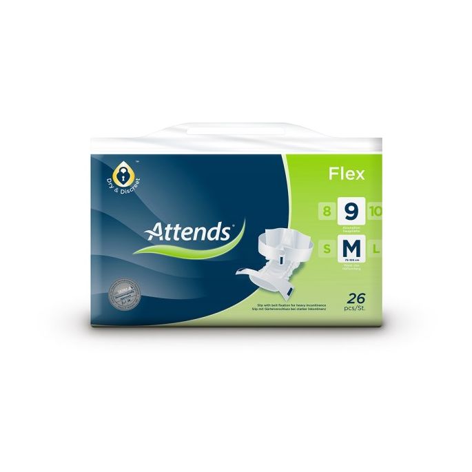 ATTENDS Flex 9 is een alles-in-één incontinentieproduct met heupband, ontwikkeld voor situaties waarin sprake is van zware urine- en/of ontlastingsincontinentie. Deze variant betreft maat Medium (M) en is geschikt voor gebruikers met een heupomvang van 75 tot 105 cm. Het product combineert een hoog absorptieniveau met een flexibel en gebruiksvriendelijk fixatiesysteem, waardoor het zowel door de gebruiker zelf als met ondersteuning van een zorgverlener kan worden aangebracht.
