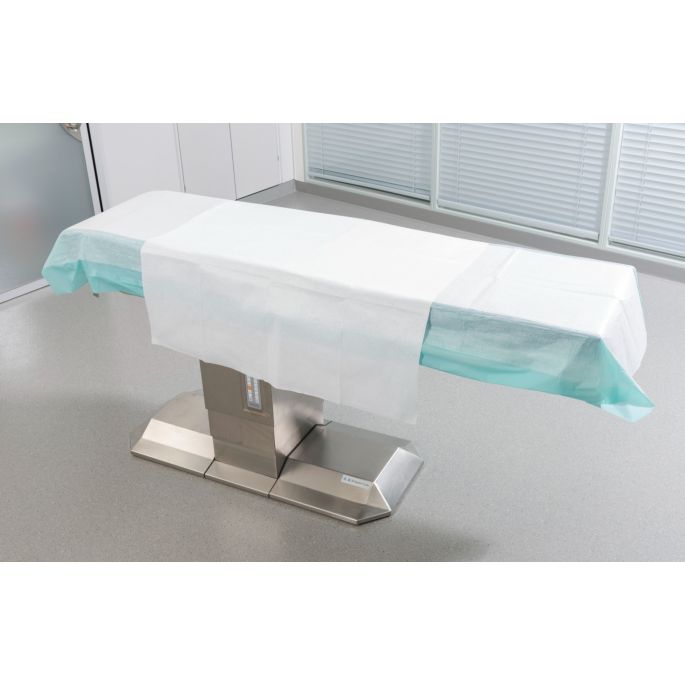 De Foliodrape® Patiëntenonderlegger wordt vóór de ingreep over de operatietafel gelegd, zodat het volledige ligoppervlak wordt bedekt. Nadat de onderlegger correct is gepositioneerd, kan de patiënt op de tafel worden geplaatst. Tijdens gebruik vangt de onderlegger lichaamsvloeistoffen op die vrijkomen, waardoor het onderliggende oppervlak schoon blijft.