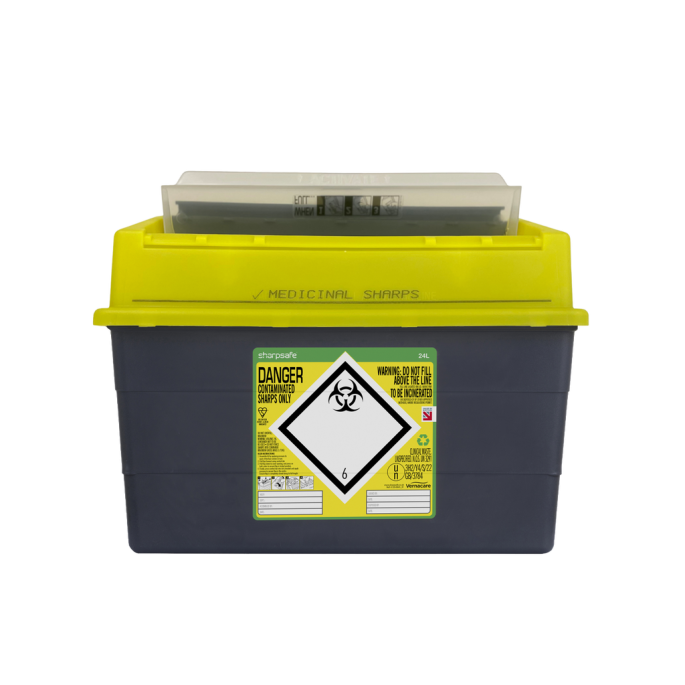 De Sharpsafe naaldencontainer van 24 liter is geschikt voor het veilig verzamelen en afvoeren van scherp medisch afval, waaronder gebruikte naalden, spuiten, lancetten en scalpelmesjes. Het grote volume maakt de container geschikt voor locaties waar doorlopend grote hoeveelheden scherp afval worden gegenereerd. De brede horizontale vulopening biedt meer ruimte bij het afvoeren van grotere scherpe artikelen en laat een verhoudingsgewijs hogere vulgraad toe dan vergelijkbare containers met een verticale opening.